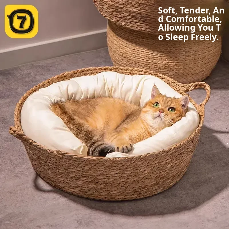Handwoven Cat Bed for All Seasons - Summer Cooling Basket with Scratching Board, Removable and Washable, Perfect for Your Feline Friend's Cozy Sleep!