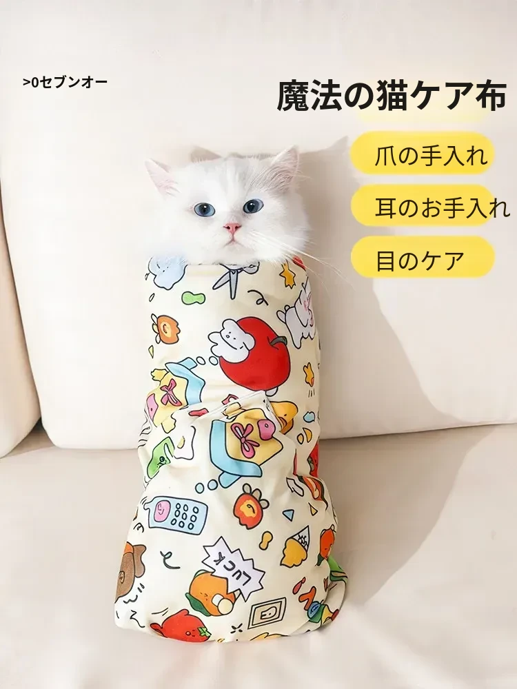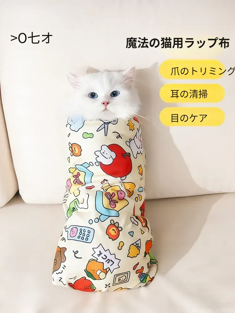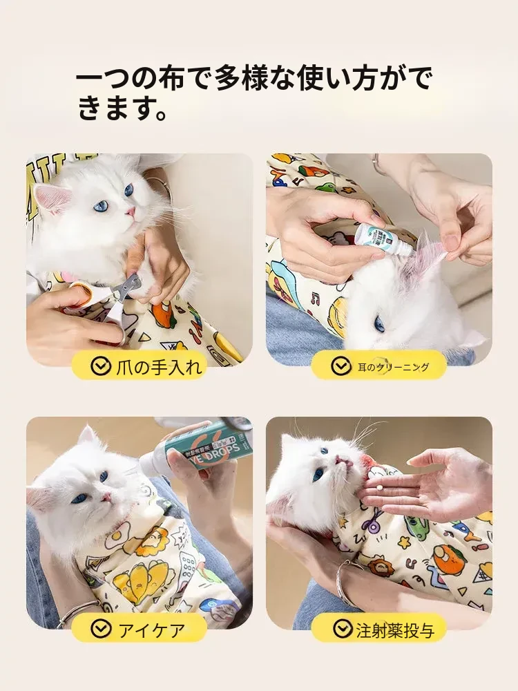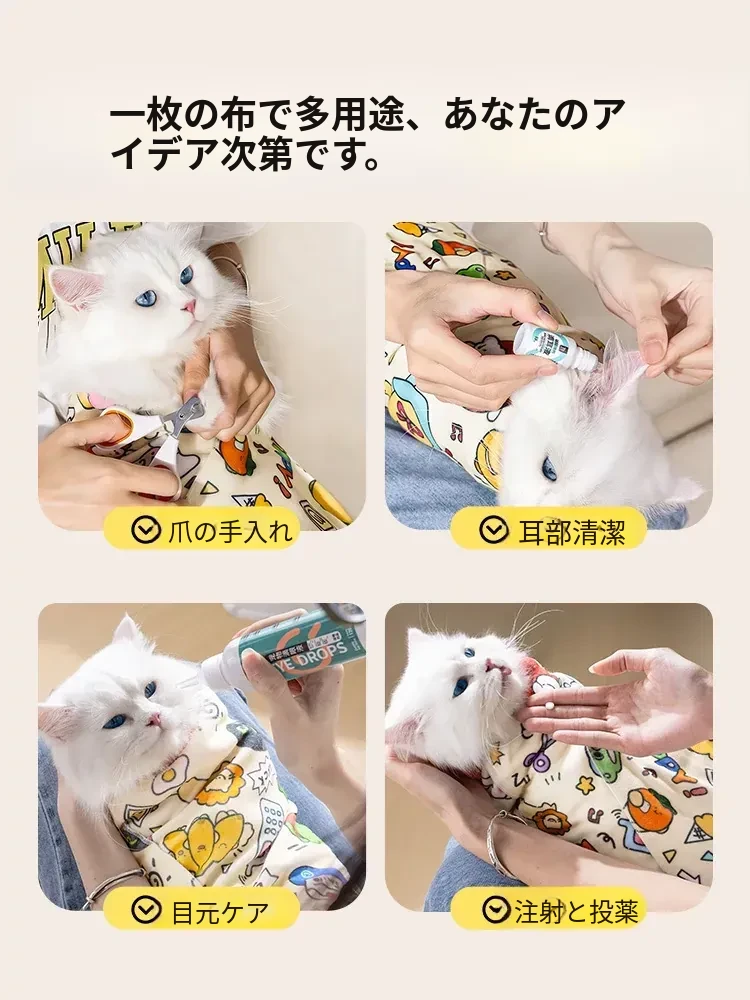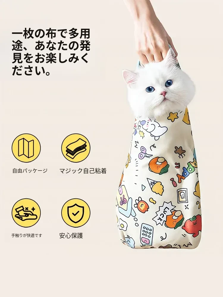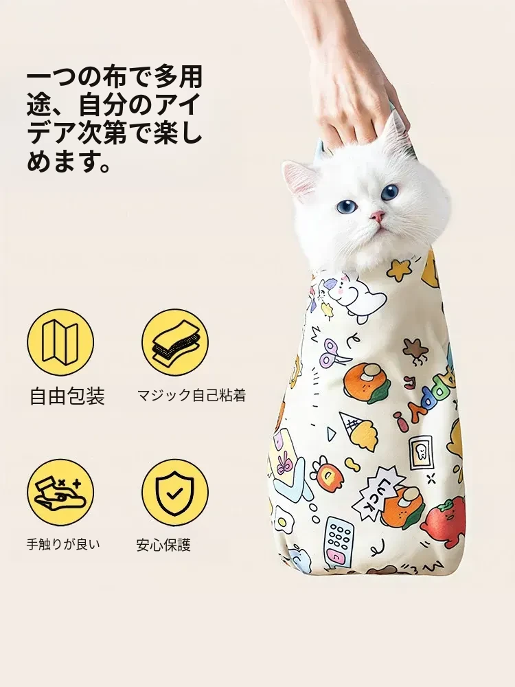 猫の爪切りを安全に!防抓・防噛の猫用固定袋 - 自粘式ペット用バスバッグ、愛猫を安心してお手入れできます♪
