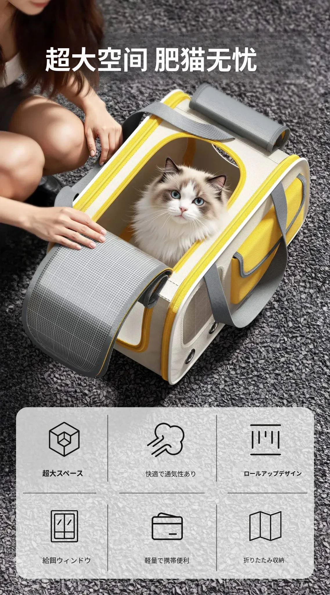 猫ちゃんとお出かけ!軽量・コンパクトな大容量リュック型ペットキャリー。折りたたみ可能で、愛犬や愛猫との楽しい冒険をサポートします!