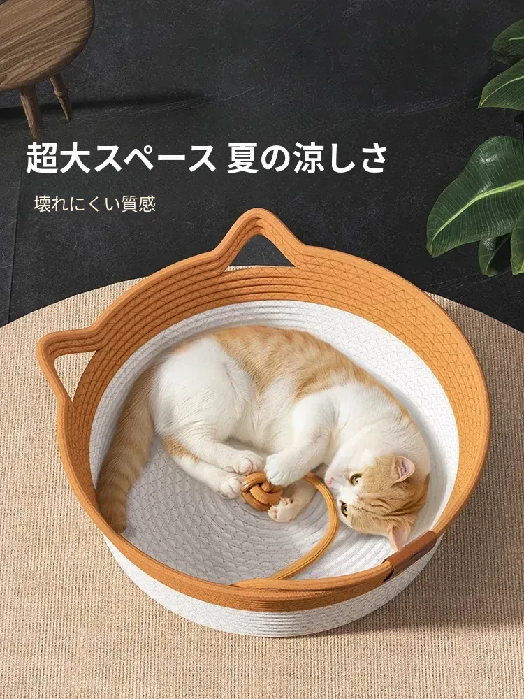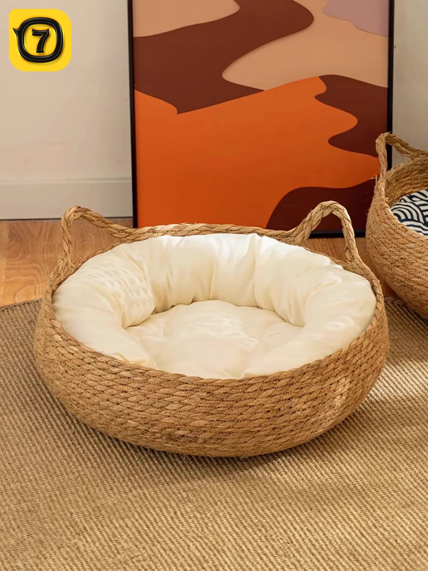 粗麻の藤編み猫ハウス|オールシーズン対応|夏にぴったりの快適な寝床|愛猫のための心地よいマット|犬用ベッドとしても◎|夏のペットライフをもっと楽しく!